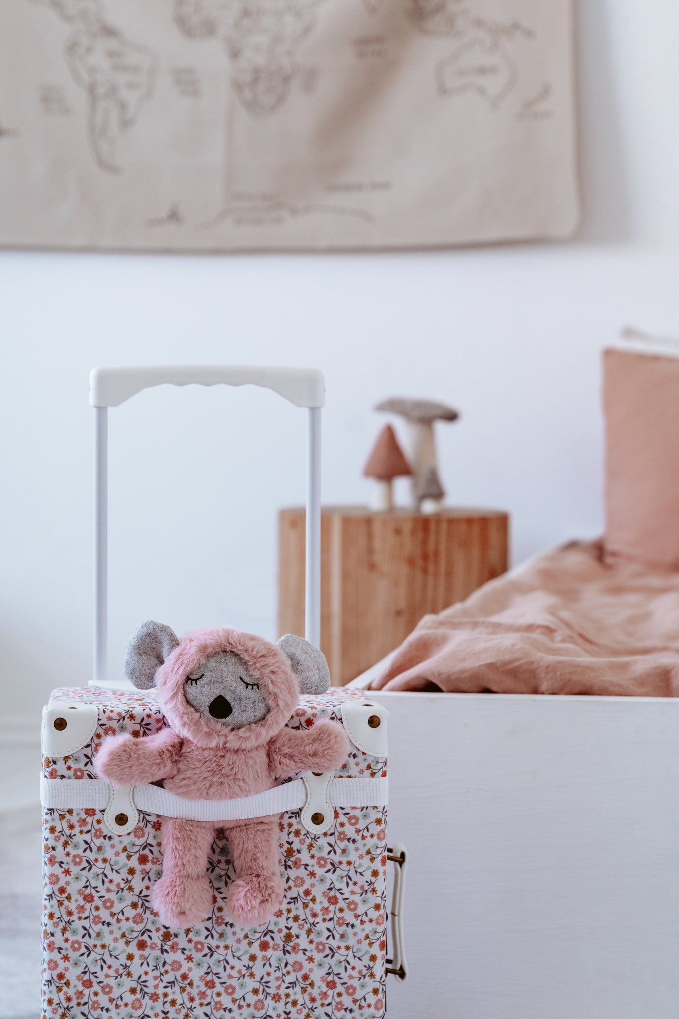 Meet Mavis Koala, your new super soft, cuddly, forever friend. Mavis is made with a heavenly soft plush fabric in blush pink. She has a wool felt face and sleepy eyes, dreaming of all her adventures to come. Measures 25cm tall.