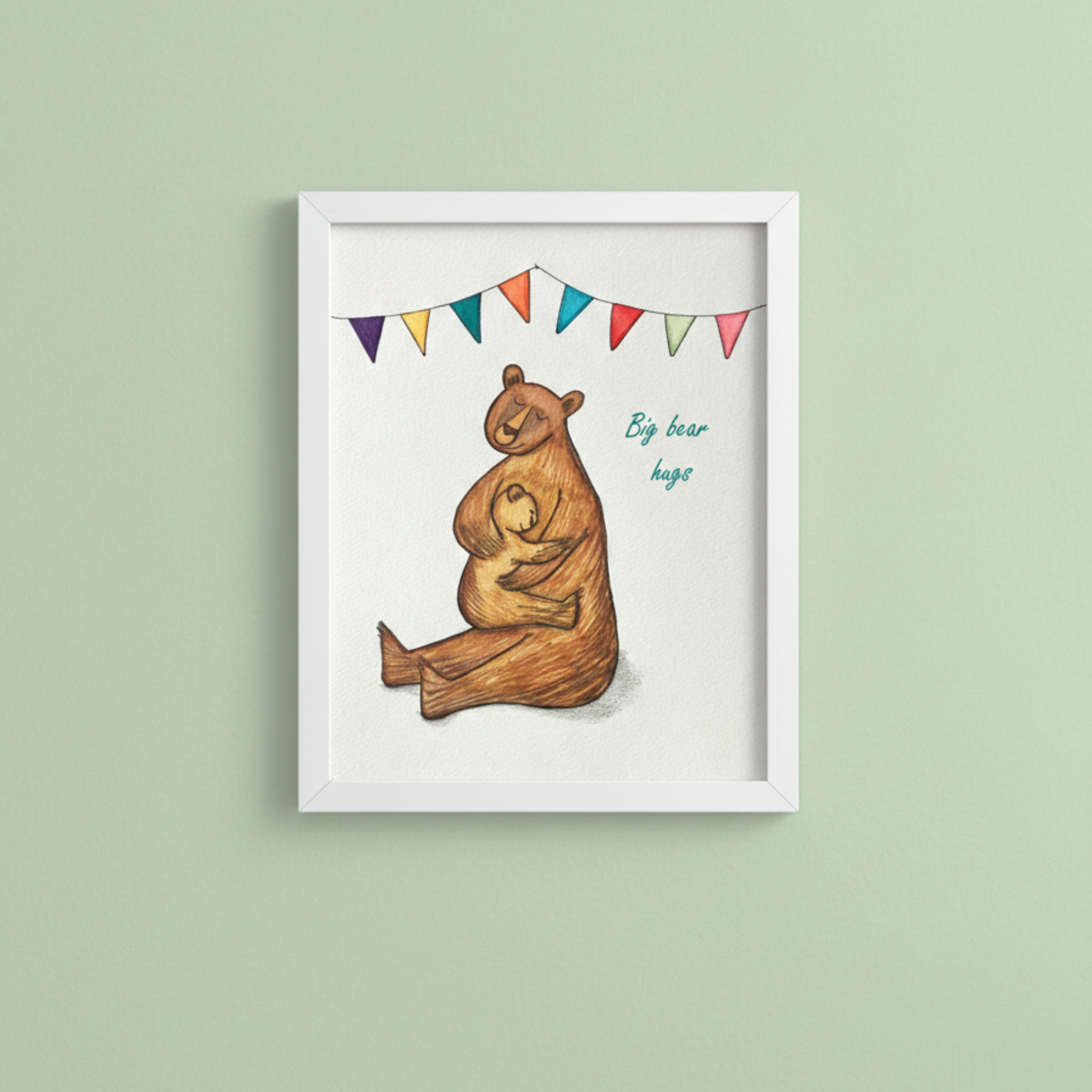 Bring warmth and comfort to your little one’s space with our Big Bear Hugs print, featuring a heart-melting illustration of a big bear and a small bear sharing a cuddle. Full of love and reassurance, this sweet design celebrates closeness, comfort, and the special bond between parent and child.
